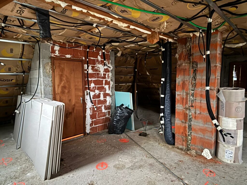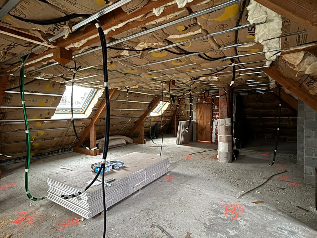 L’isolation est quasiment terminée, il reste les murs autour des fenêtres. Les électriciens sont intervenus hier, il y a des câbles partout. C’est bien, ça avance.