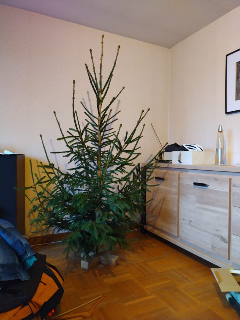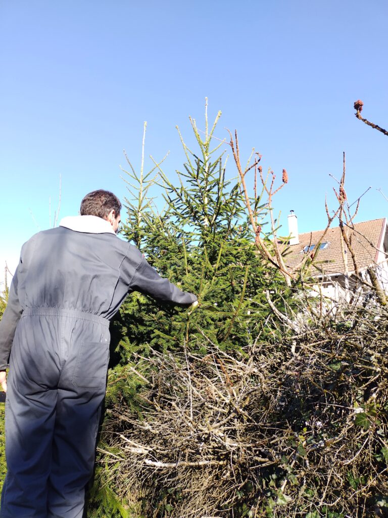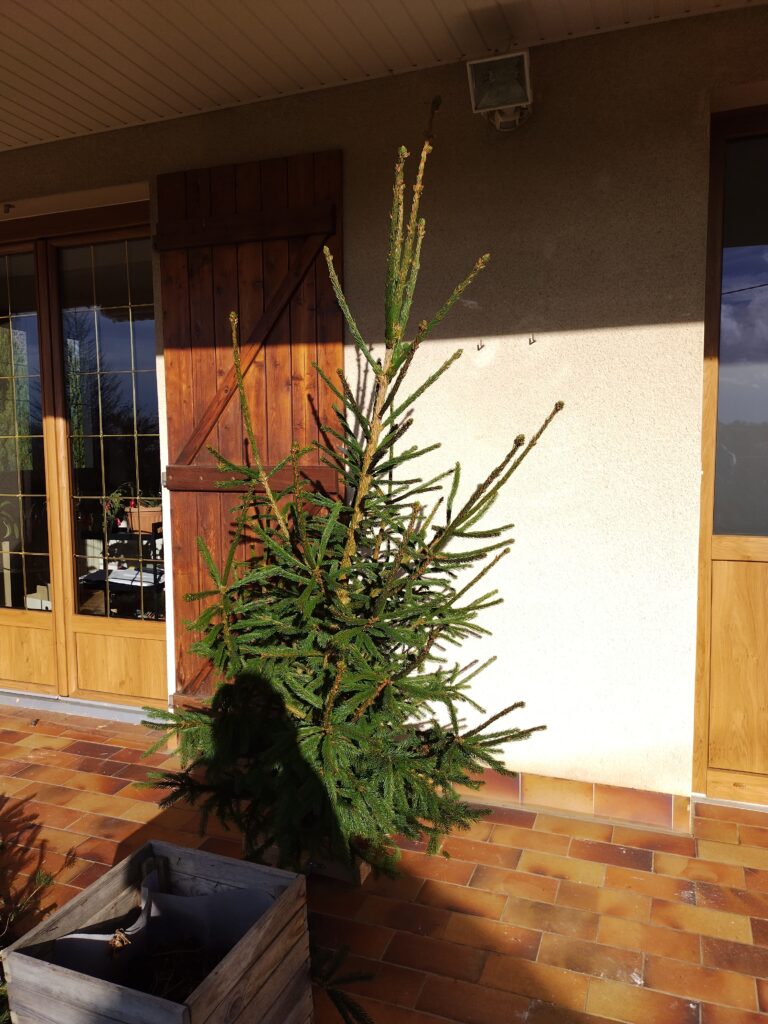 Ça fait un moment que j’émets l’idée de couper le sommet de notre haie pour faire un vrai sapin. Et bien voilà, merci mon coeur. Merci d’avoir coupé la haie et d’avoir fait un support pour notre sapin et de l’avoir mis droit.